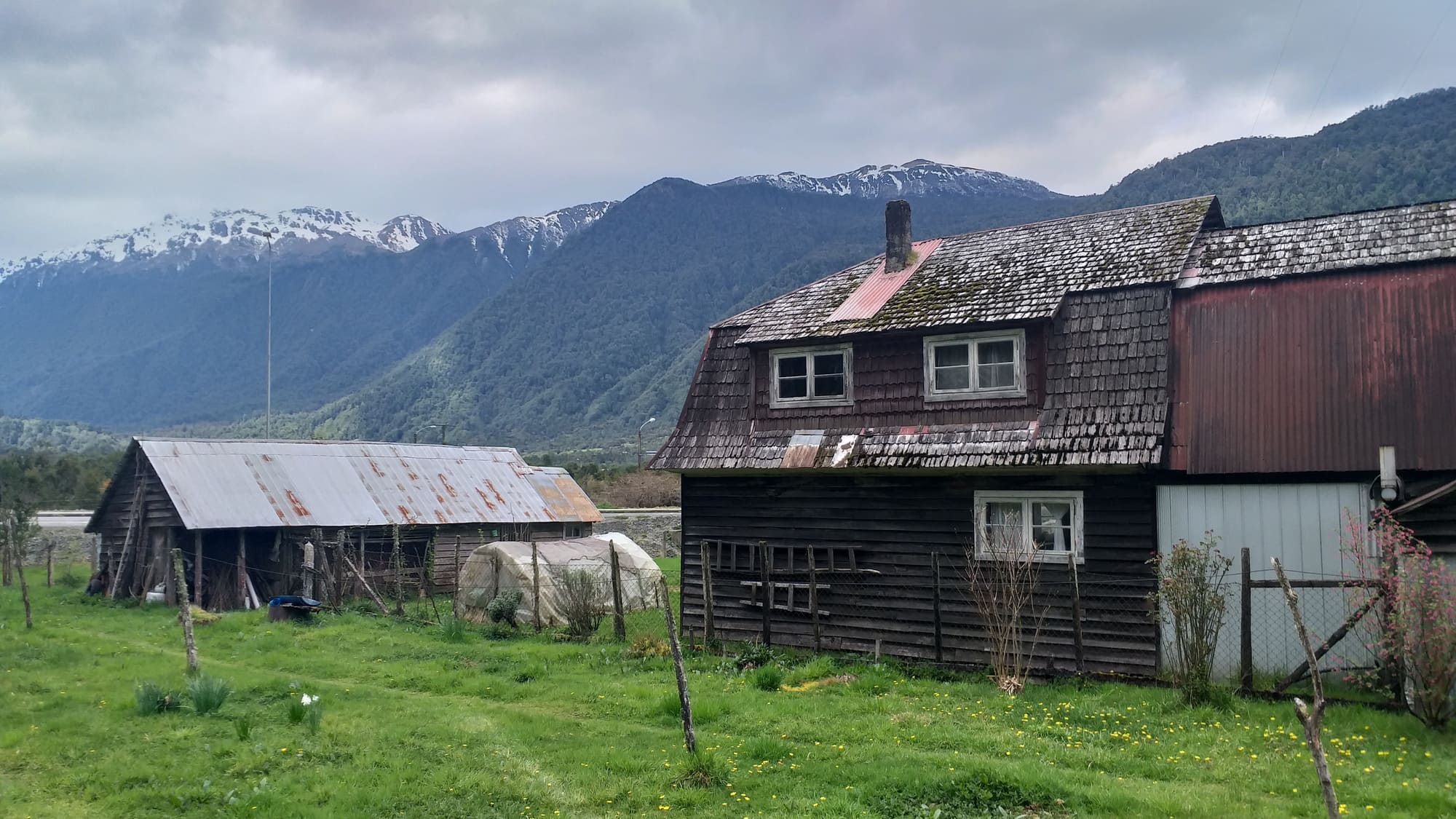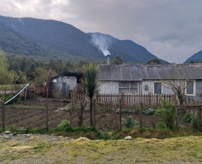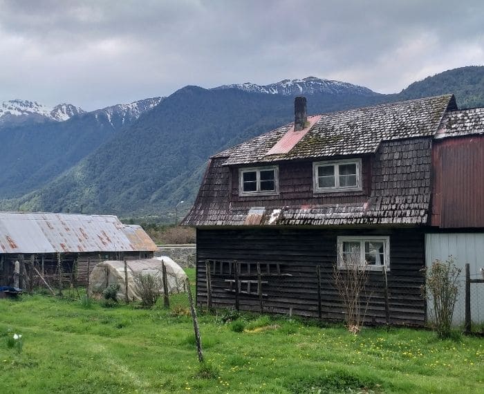 Localidad de Puyuhuapi, comuna de Cisnes, región de Aysén. Casa de colono de subsistencia con su pequeña huerta.